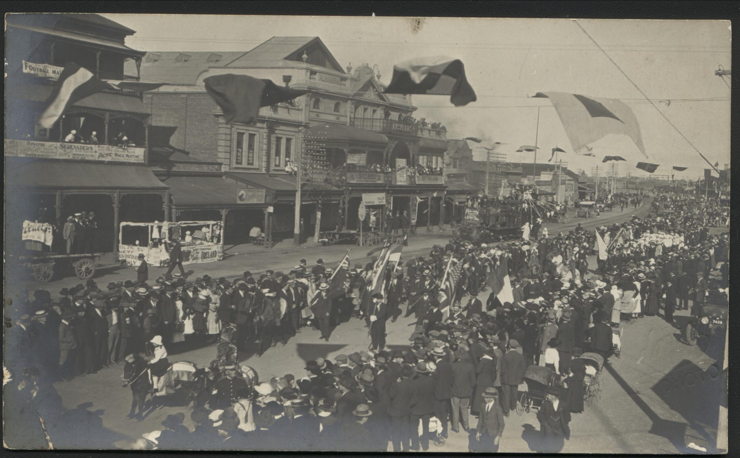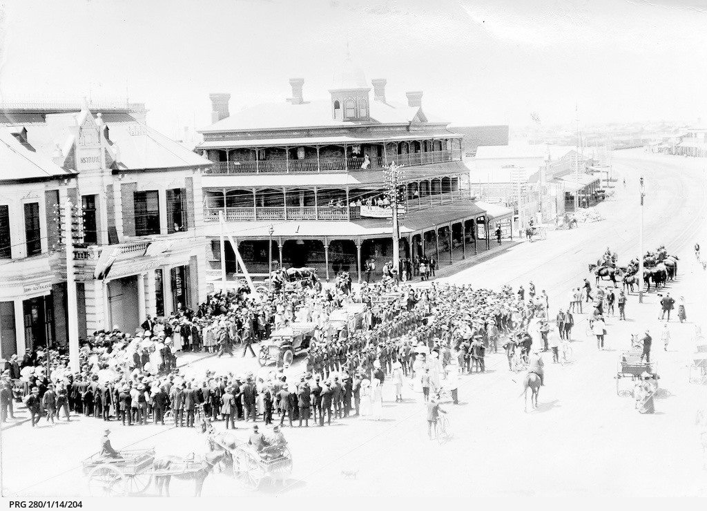 1915 Sir Ronald Munro Ferguson, Governor-General of Australia and Sir Henry Galway, Governor of South Australia arriving at the Institute Building, Ellen Street, Port Pirie, South Australia.