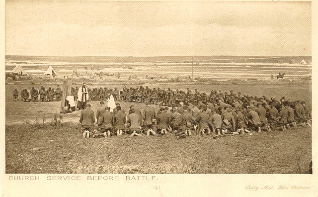 Church of England service on the battle field for trops going into the trenches - officiating from a small field altar