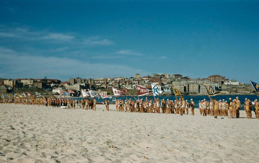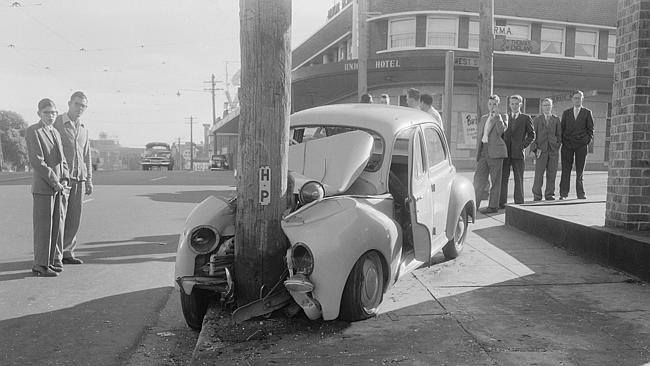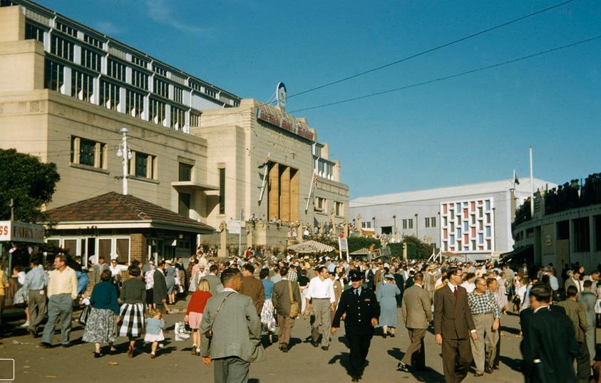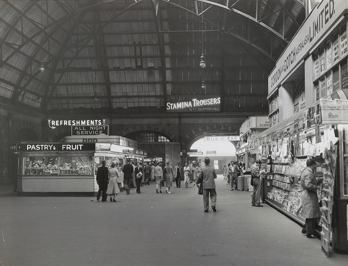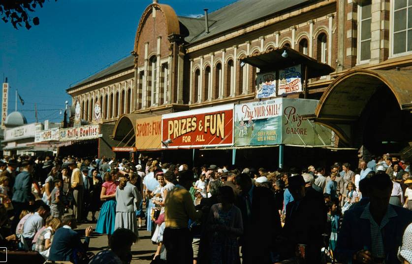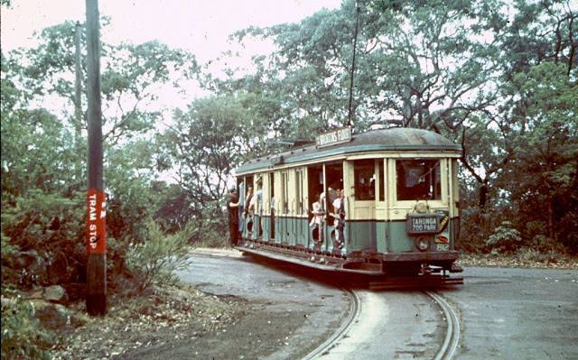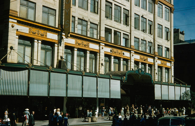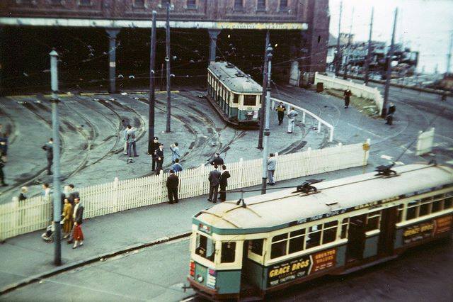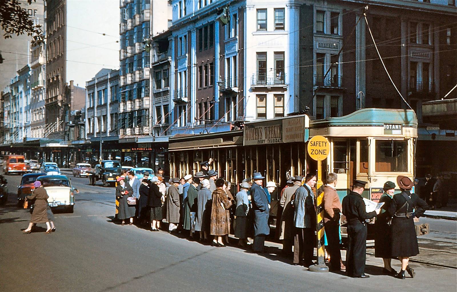 1950's. Tram passengers line up at Market Street stop on Elizabeth Street