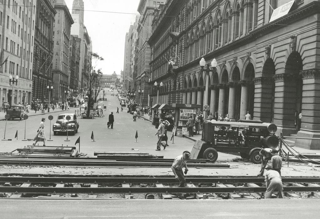 1953 Sydney . Construction of tram tracks at Martin Place