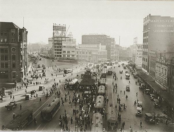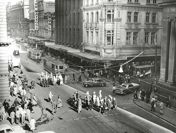 1950 circa . Trams operating at the intersection of Barrack Street and George Stree