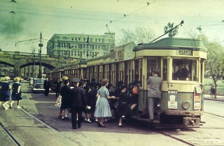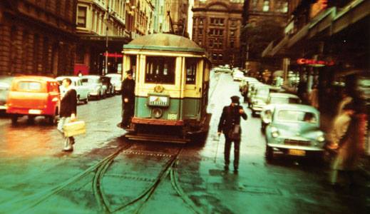 1955. A tram travels along Loftus St
