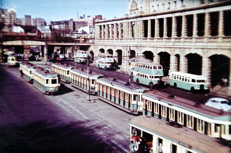 1955 circa Trams and traffic at Railway Square