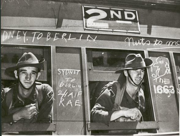 1940. Royal Australian Engineers on a train leaving for overseas service from Sydney