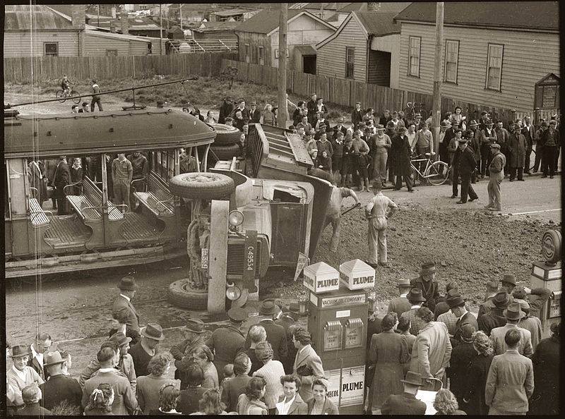 1940's. Botany Road, Mascot, collision between a truck and K-class tram.