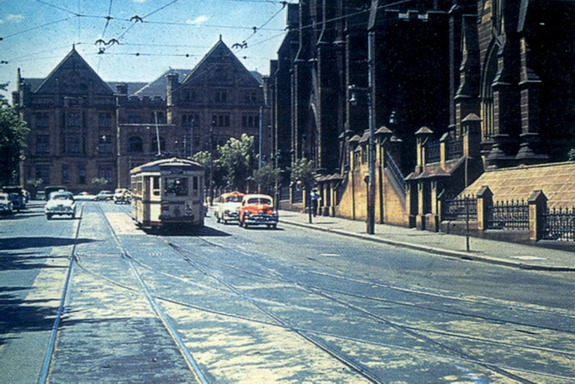 1950's. College Street, with St Mary's Cathedral on the right