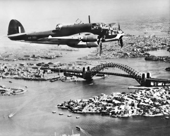 1944. An Australian built DAP Bristol Beaufort VIII aircraft in flight over Sydney Harbour