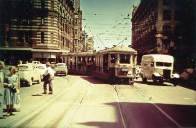 1945 circa . A tram turns from Elizabeth Street into Liverpool Street
