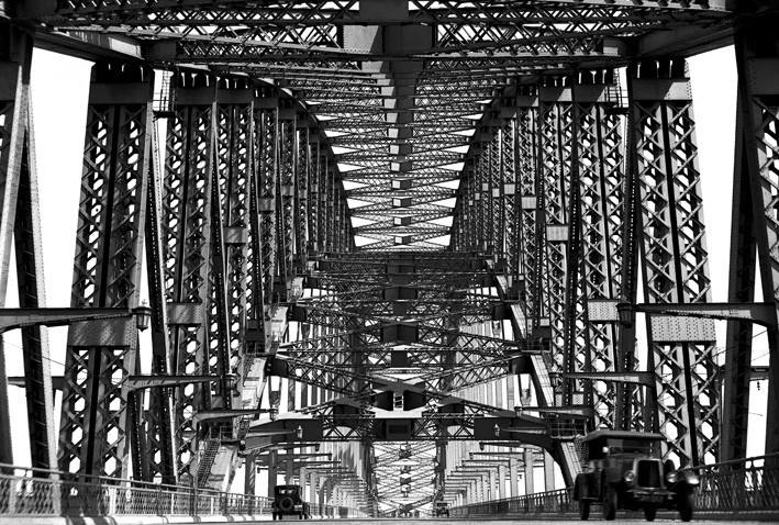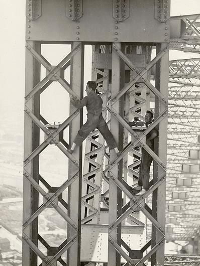 1932. A brave worker takes strain measurements during the final stages of the construction of the Sydney Harbour Bridge