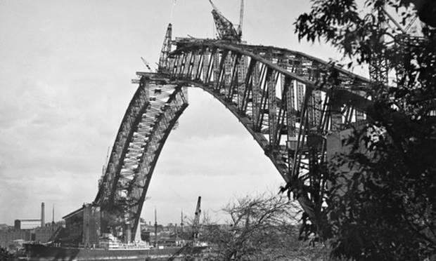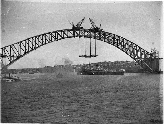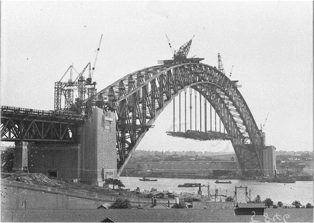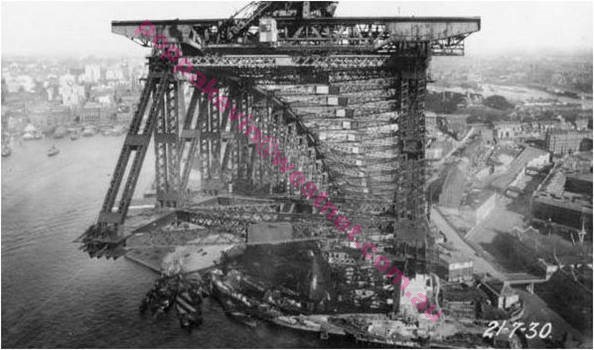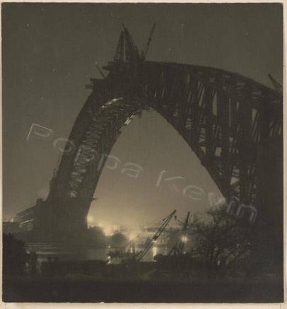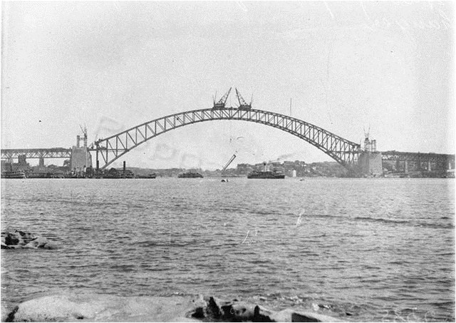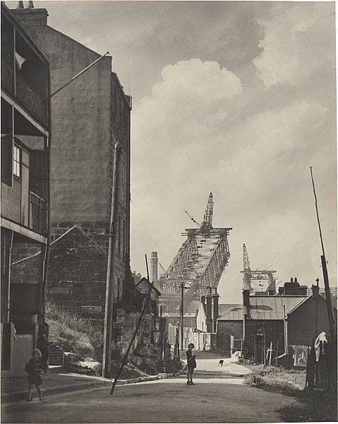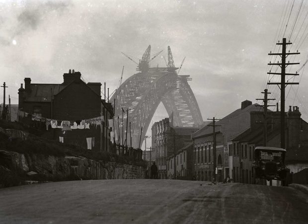 1931 A view of George Street from Grosvenor Street, looking northward to the Sydney Harbour Bridge that is under construction.