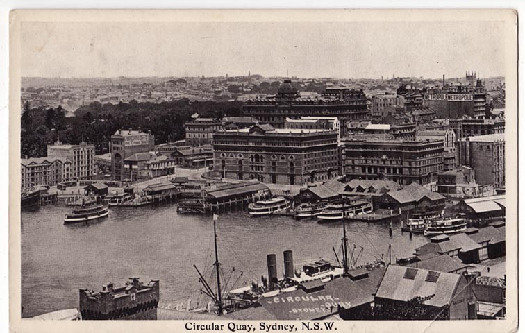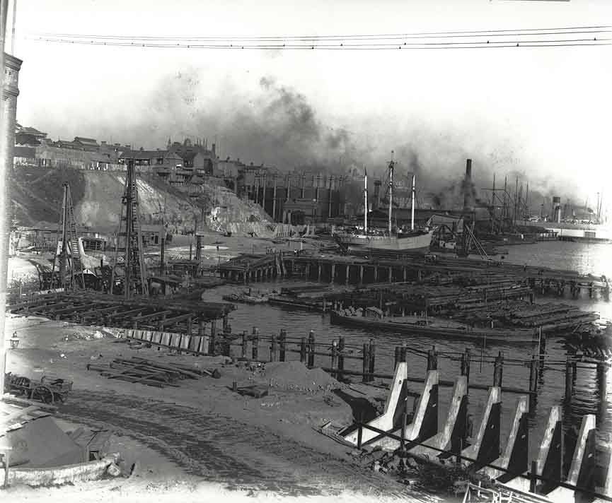 1909. View of the reconstruction of Darling Harbour from Millers Point showing Dalgetys Wharf No.1
