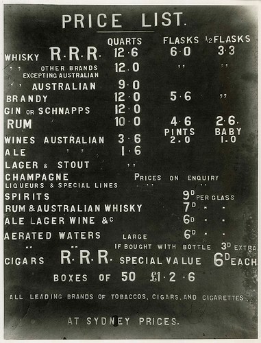 1920 circa Alcoholic beverages price list. Central Railway Station, Sydney