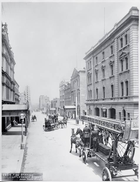 1890c Castlereagh Street. Horse-drawn Fire Appliances outside the City Fire Station